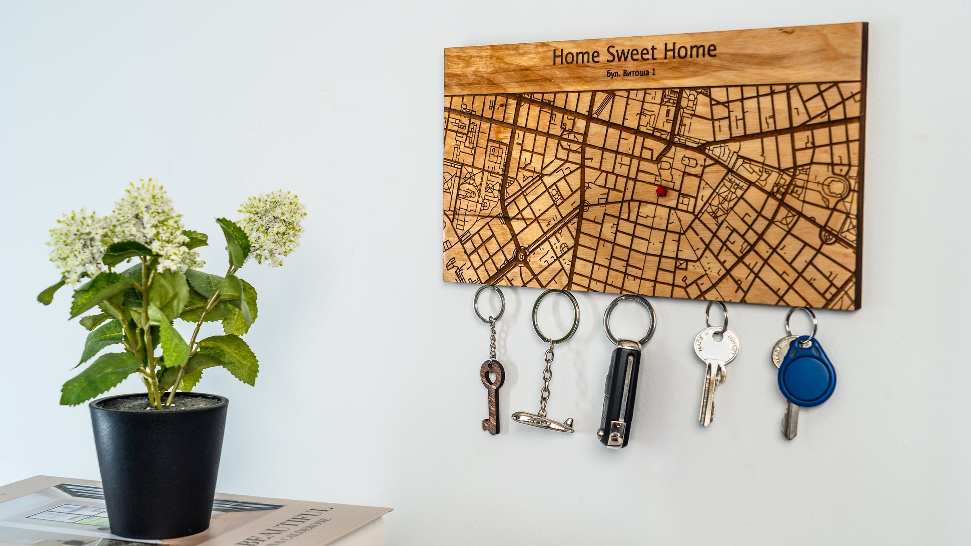Тази дървена стойка за ключове съчетава функционалност, дизайн и лично значение в едно стилно интериорно решение. Върху дървената основа е гравирана карта на реална локация.
