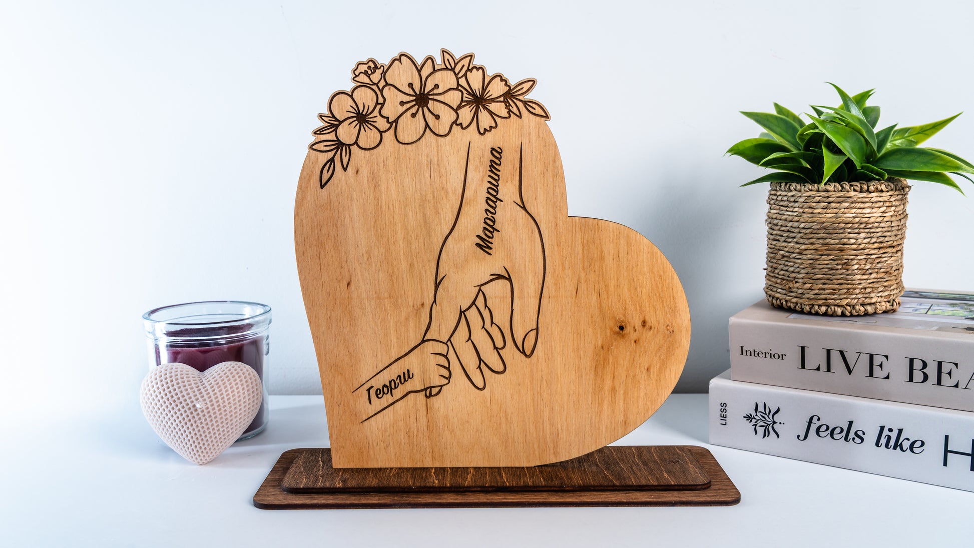Тази ръчно изработена дървена декорация във формата на сърце символизира връзката, любовта и единството в семейството. Всяка ръка е гравирана с име по избор, а централната фигура представя човека, който събира всички заедно.
