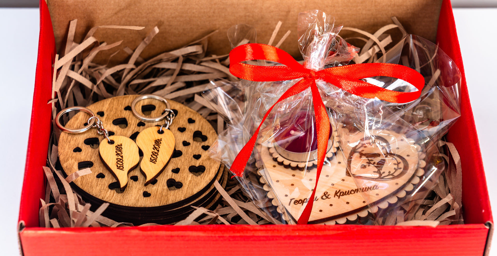 Комплектът включва ключодържател с гравирани текст по избор, поставка за чаена свещ с текст по избор и 4 дървени подложки за чаши, които допълват интериора с естествен и топъл акцент. Всички елементи са изработени от дърво с фина и прецизна гравюра.